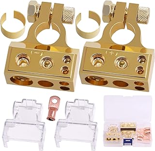 Rustark 1 Paar 0/4/8/10 Gauge AWG Positive negative Autobatterieklemmen-Anschlüsse mit 2 transparenten Abdeckungen und Unterlegscheiben für Auto, Wohnwagen, Boot, Wohnmobil (Gold)